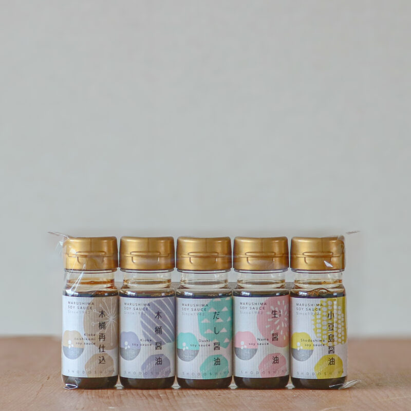 小豆島の伝統製法で仕込んだ、個性豊かな5種類のお醤油を、可愛いミニボトルのセットにしました。「木桶再仕込」「木桶醤油」「だし醤油」「生醤油」「小豆島醤油」の5本入りで、食卓を彩ります。